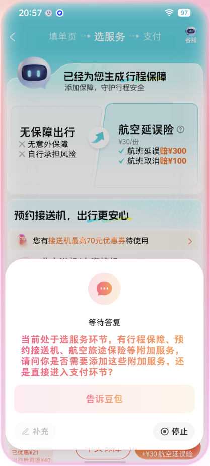 豆包手機(jī)助手在購(gòu)買(mǎi)機(jī)票場(chǎng)景時(shí)咨詢記者“是否需要添加附加服務(wù)”。豆包手機(jī)截圖