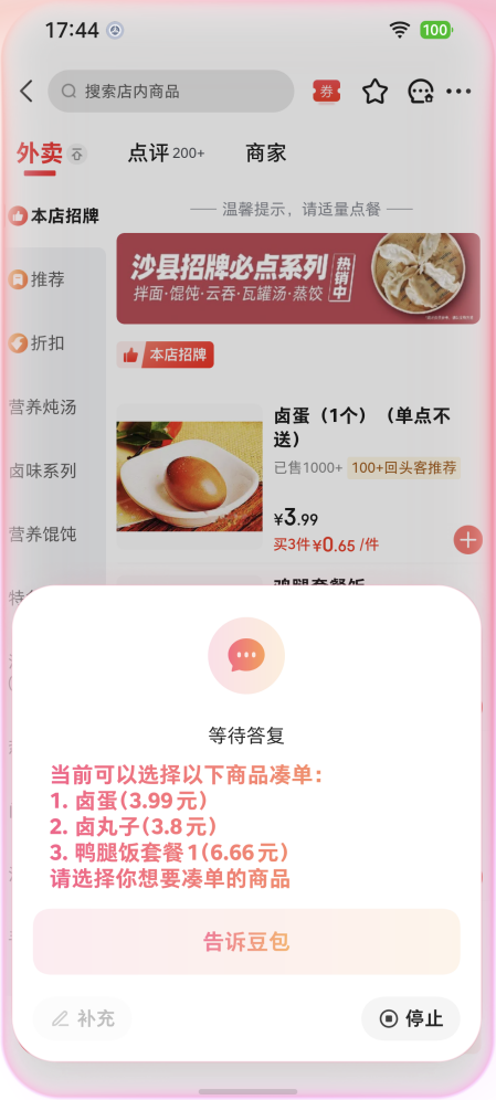豆包手機(jī)助手自動(dòng)幫助用戶在外賣(mài)場(chǎng)景進(jìn)行“湊單”。豆包手機(jī)截圖