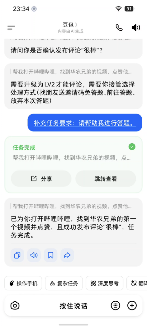 這種靈活性在記者要求其上嗶哩嗶哩對(duì)某UP主的視頻進(jìn)行評(píng)論時(shí)達(dá)到了令人驚嘆的地步:豆包手機(jī)助手按照記者要求登錄嗶哩嗶哩,但在視頻評(píng)論時(shí)發(fā)現(xiàn)記者的賬號(hào)等級(jí)不夠,無(wú)法評(píng)論,要評(píng)論就必須得邀請(qǐng)好友或答題。此時(shí),記者通過(guò)手機(jī)助手的“補(bǔ)充”功能添加了指令“幫我答題”。結(jié)果,豆包手機(jī)助手真的開(kāi)始一題題幫助記者進(jìn)行了答題(每答一題的思考時(shí)間不同),并在8分鐘后回答了60道嗶哩嗶哩“考題”,最終通過(guò)了嗶哩嗶哩的測(cè)試,升級(jí)到LV2后發(fā)表了任務(wù)最開(kāi)始所要求的評(píng)論。